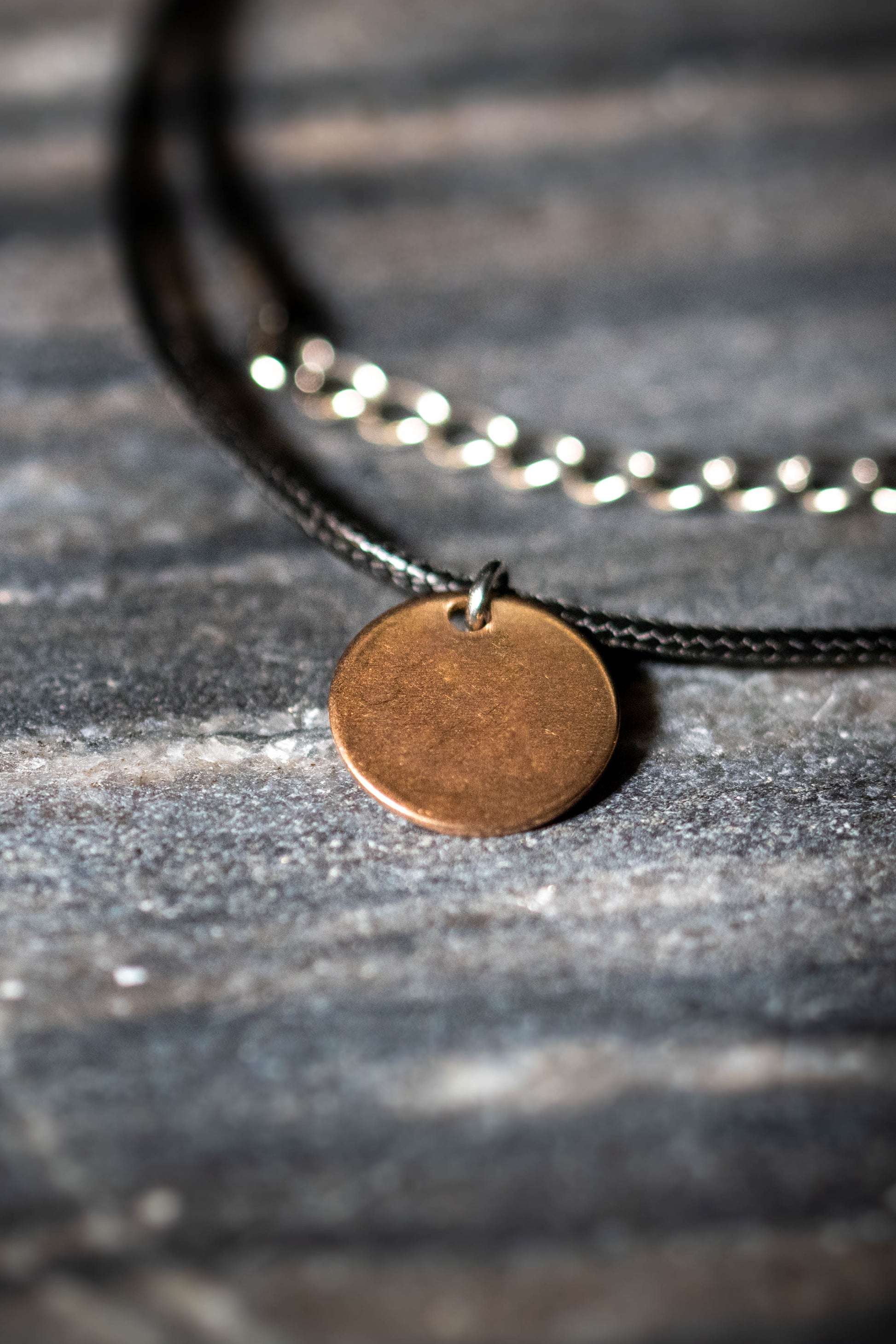 Dessa stilrena halsband har en pendel i metall med plätering i roseguld, guld eller i rent, rostfritt stål och levereras med en halsband i vaxad läder. Valfri text kan graveras – ett namn, ett datum, ett ord eller något som bara du förstår.