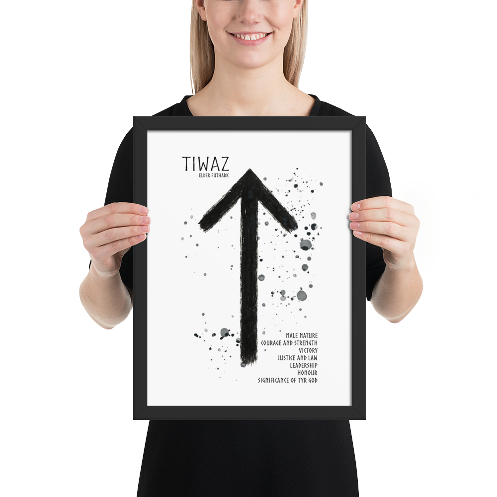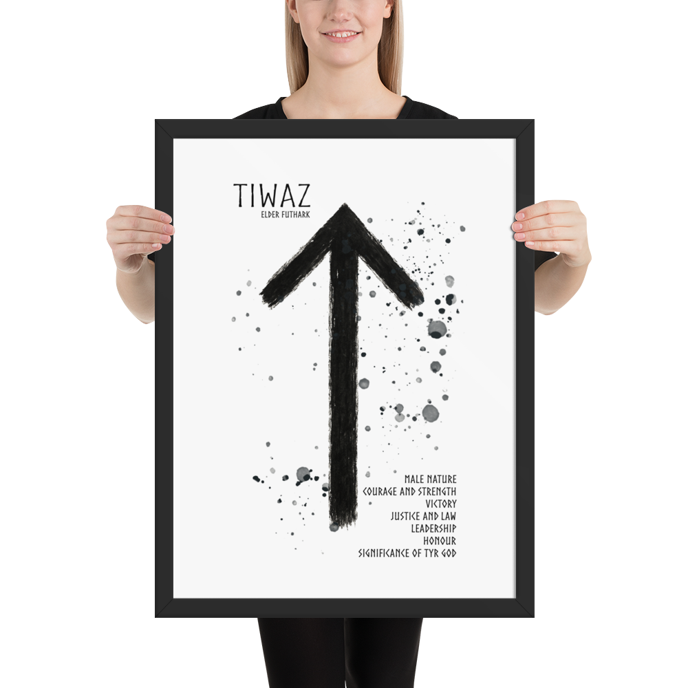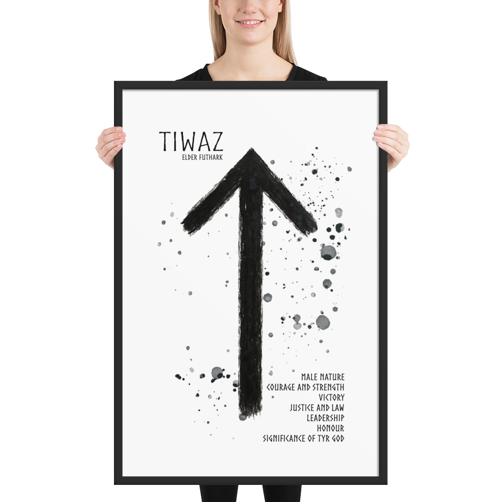 Runan Tiwaz är nära knuten till guden Tyr – den modige och rättfärdige krigsguden i nordisk mytologi. Den representerar hans anda av uppoffring, mod och rättvisa.